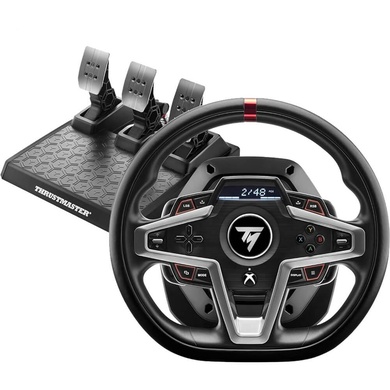 T248 features a new optimized HYBRID DRIVE system with a mixed belt and gear mechanism for powerful, realistic and versatile Force Feedback. T248 delivers 70% more power (compared with previous Thrustmaster TMX series hybrid racing wheels) and adds cutting-edge new features including Force Feedback presets that can be changed on the fly in games, magnetic paddle shifters, an interactive screen with more than 20 different displays, and a magnetic pedal set with 4 pressure modes on the brake pedal. T248 has been designed for all gamers looking for performance and immersion — including those keen to free themselves from their keyboard, mouse or gamepad, and users who want to take their racing to the next level after having started out with a wheel aimed at beginners. This brand-new racing wheel is officially licensed for Xbox Series X|S, Xbox One, and is compatible with PC. Dynamic Force Feedback: on-the-fly Force Feedback level adjustment (3 preset modes included) via the screen, compatible with all games Magnetic paddle shifters (patented H.E.A.R.T technology) for instant responsiveness, and a super-clear gear shifting feel Magnetic pedal set (patented H.E.A.R.T technology) for incredible 12-bit resolution precision that won’t decrease over time 4 distinct pressure modes on the central pedal for optimized braking according to the configuration and gaming setup (desk, cockpit, stand, etc.) Next-generation HYBRID DRIVE system delivering 70% more power than other Thrustmaster hybrid racing wheels (TMX series)